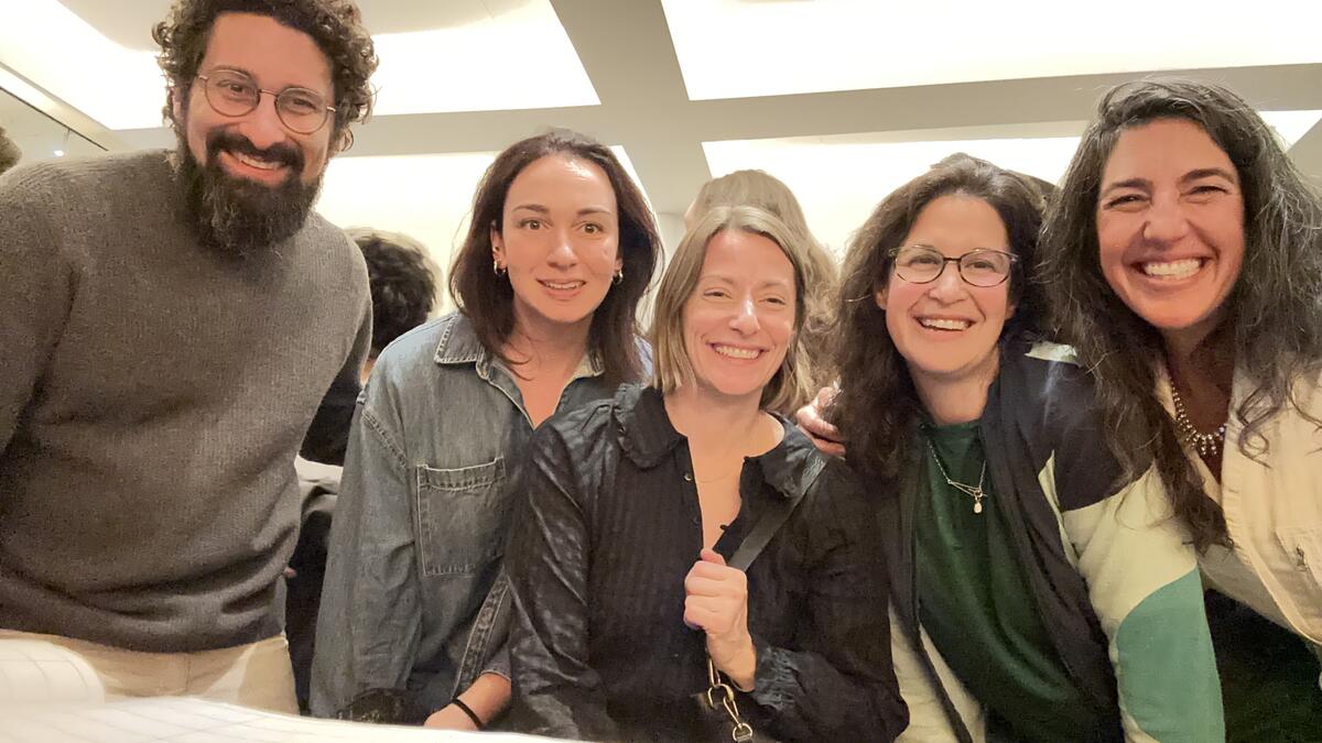 (L-R): Former Usdan videographer Lou Gruber, former Usdan Art Chair Amy Beecher, former Education Director Jillian Greenberg, former Dance Chair Juliana May with Executive Director Lauren Brandt Schloss at Juliana's latest performance of Optimistic Voices at BAM on November 8, 2025.